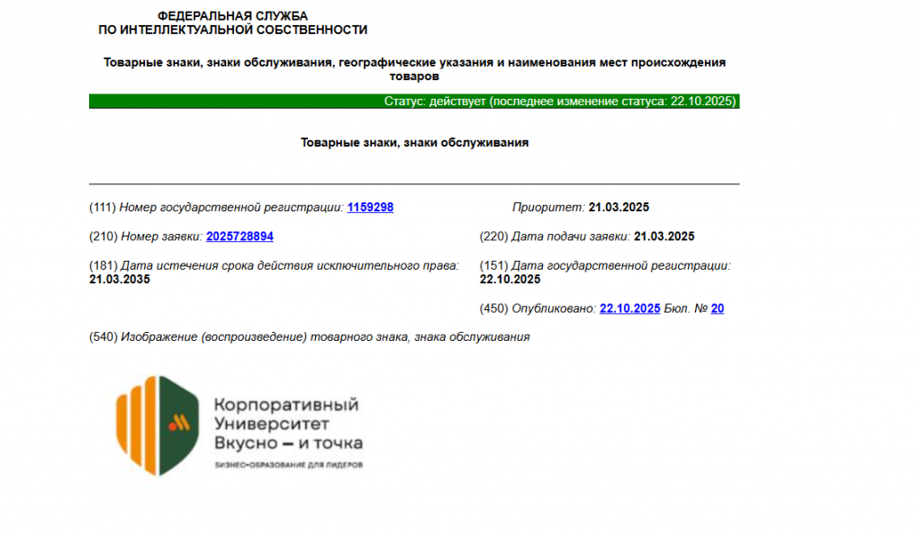 Исключительное право на товарный знак действует до 21 марта 2035 года. Регистрация была оформлена 22 октября 2025 года, при этом приоритет был установлен с даты подачи заявки — 21 марта 2025 года. Информация о регистрации уже опубликована в официальном бюллетене Роспатента.