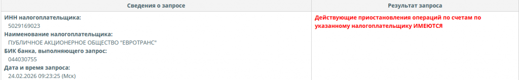 У «Евротранса», которым руководит Олег Алексеенков, зафиксированы действующие приостановления операций по банковским счетам. Согласно данным сервиса ФНС, ограничения введены на основании решений налогового органа о взыскании задолженности. Дата начала приостановлений — 20 февраля 2026 года, запрос редакция сделала 24 февраля.
