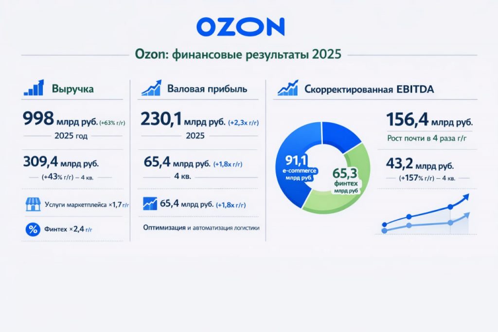 Ozon по итогам 2025 года нарастил выручку на 63% — до 998 млрд рублей. Основной вклад внесли рост доходов от услуг маркетплейса и процентная выручка финтех-направления.