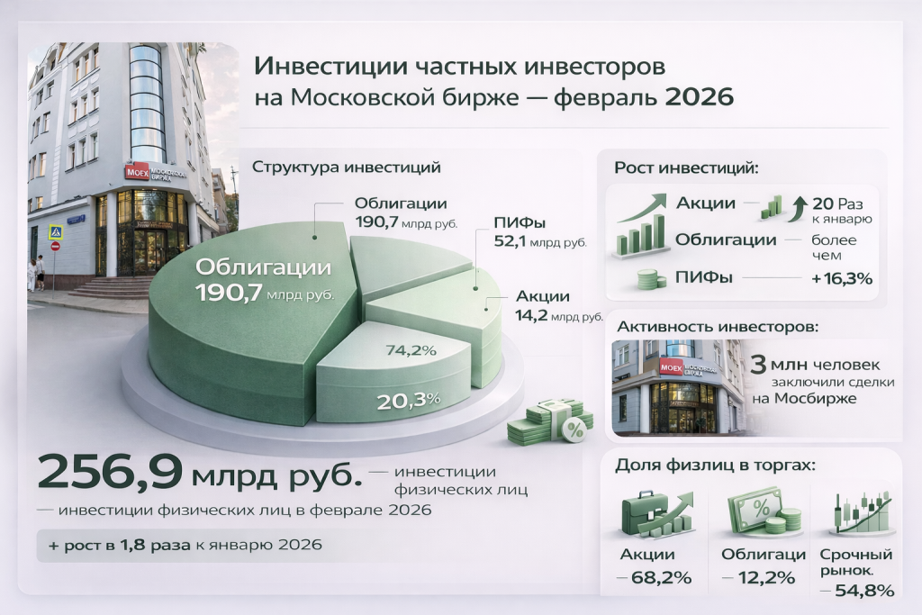 Инвестиции частных инвесторов на рынке Московской биржи в феврале 2026 года резко выросли после слабого января. Общий объем вложений физических лиц в ценные бумаги достиг 256,9 млрд руб., увеличившись в 1,8 раза за месяц, сообщила площадка.
