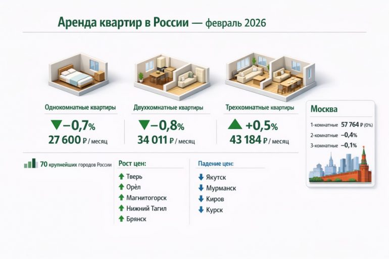 В феврале 2026 года средние арендные ставки на квартиры в 70 крупнейших городах России снизились для одно- и двухкомнатных квартир, трехкомнатные же показали небольшой рост. Такие данные приводит «МИР КВАРТИР».