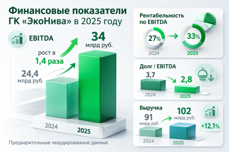 Крупнейший в России производитель сырого молока, группа «ЭкоНива», по предварительным неаудированным данным увеличила показатель EBITDA по итогам 2025 года до 34 млрд рублей. Годом ранее этот показатель составлял 24,4 млрд рублей, таким образом операционная прибыль компании выросла примерно в 1,4 раза. Данные раскрыты в презентации группы, подготовленной к размещению дебютного облигационного выпуска.