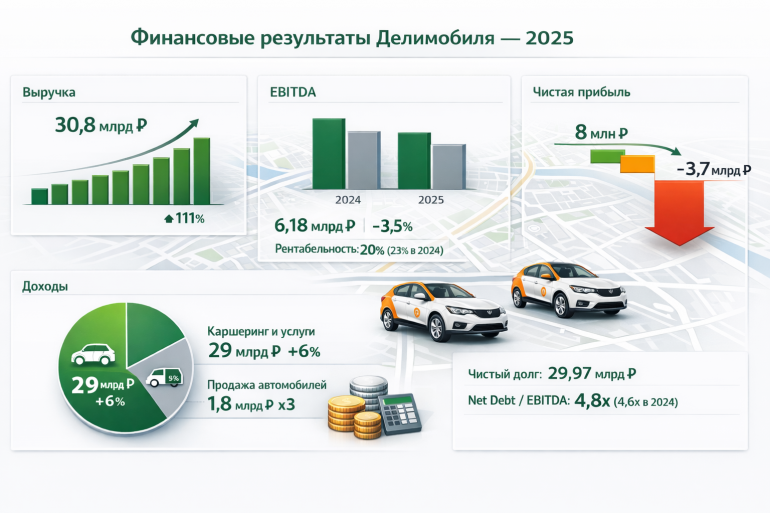 Делимобиль (ПАО «Каршеринг Руссия») завершил 2025 год с ростом выручки, однако год оказался для компании убыточным. Общий оборот оператора каршеринга увеличился на 11% и достиг 30,8 млрд рублей, следует из раскрытых финансовых результатов компании.