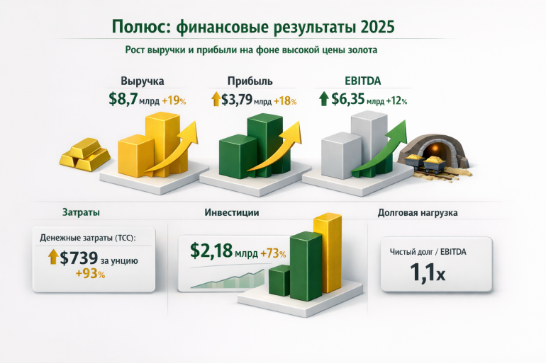 Золотодобывающая компания «Полюс» опубликовала финансовые и производственные результаты за 2025 год. Отчетность показывает рост ключевых показателей на фоне благоприятной ценовой конъюнктуры на рынке золота.