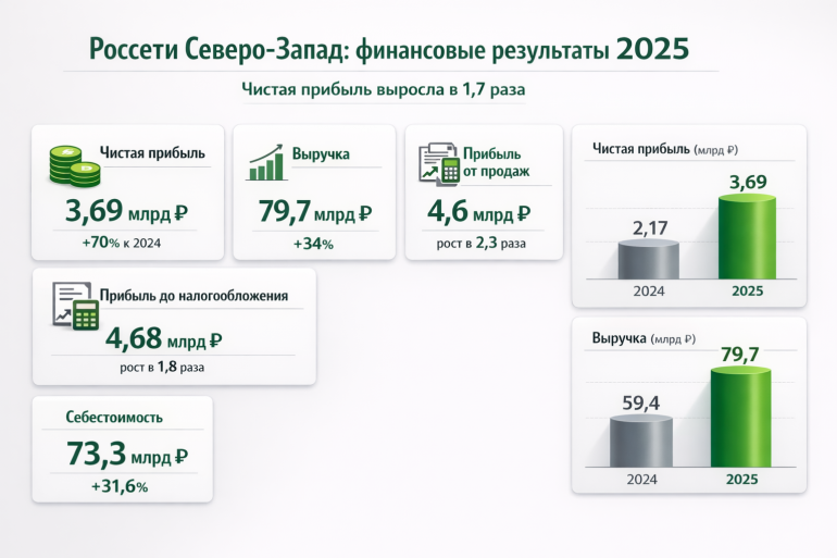ПАО «Россети Северо-Запад» по итогам 2025 года заметно нарастило финансовые показатели. Согласно отчетности по РСБУ, чистая прибыль компании составила 3,69 млрд рублей — это в 1,7 раза больше результата предыдущего года.