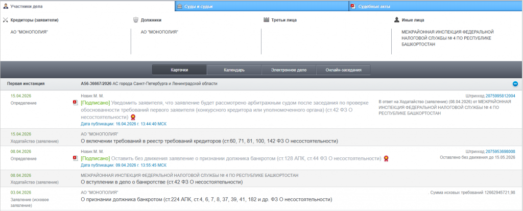 Первой в Арбитражный суд Санкт-Петербурга и Ленинградской области обратилась сама компания — 28 марта 2026 года АО «Монополия» направило заявление о признании себя банкротом. Уже через три дня, 31 марта, к делу присоединилась Межрайонная инспекция ФНС №4 по Республике Башкортостан, подав собственное заявление о несостоятельности должника. К слову, об участии ФНС Башкирии в банкротных исках в качестве истца редакция Аbn.Аgency писала ранее.