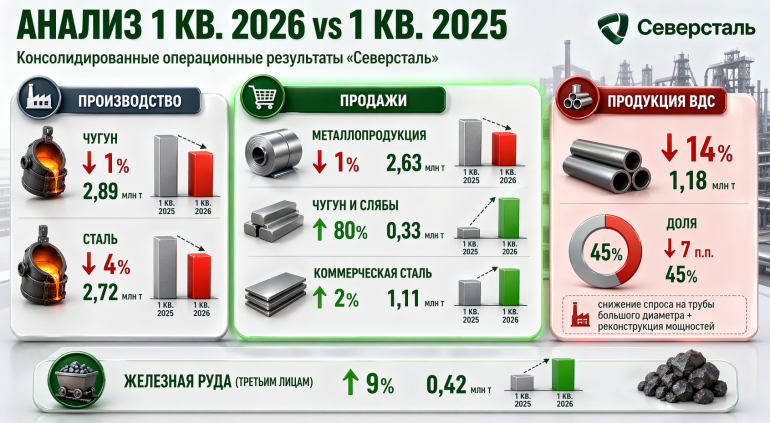 «Северсталь» по итогам первого квартала 2026 года зафиксировала умеренное снижение ключевых производственных показателей при разнонаправленной динамике продаж. Согласно операционной отчетности компании, выпуск стали и чугуна сократился в годовом выражении, тогда как отдельные сегменты сбыта, напротив, продемонстрировали рост.