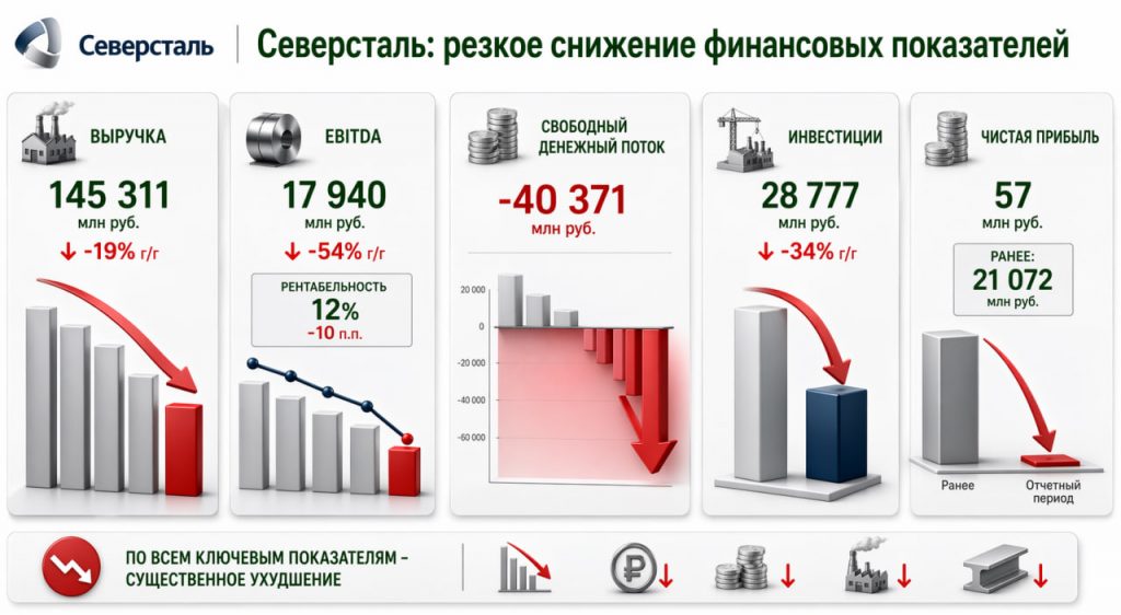 Выручка «Северстали» по итогам 1 кв. 2026 года снизилась на 19% год к году и составила 145,3 млрд руб. Основной причиной стало падение средних цен на металлопродукцию, а также изменение структуры продаж — доля полуфабрикатов в портфеле выросла.