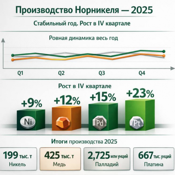 Норникель завершил 2025 год в рамках производственных ориентиров, сохранив устойчивость по ключевым металлам и представив сдержанный прогноз на 2026 год. Компания продолжает модернизацию и инвестирует в технологические проекты.